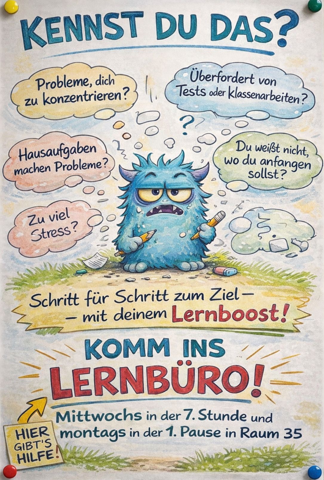 Sträubst du dich also beim Gedanken an die nächste Klassenarbeit oder steckst du beim Vokabellernen völlig fest? Montags in der ersten Pause und mittwochs in der 7. Stunde widmen wir uns im Lernbüro deinem persönlichen Anliegen. Wir finden gemeinsam eine Lösung!